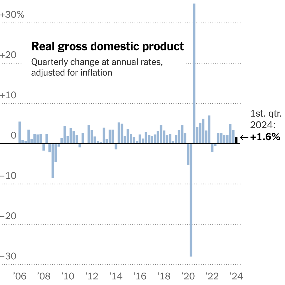 Gross domestic product, adjusted for inflation, increased at a 1.6 percent annual rate in the first three months of the year.Gross domestic product, adjusted for inflation, increased at a 1.6 percent annual rate in the first three months of the year. United States Economy, Consumer Behavior, Interest Rates, Prices (Fares, Fees and Rates), Commerce Department, Federal Reserve System, United States, Gross Domestic Product Read More